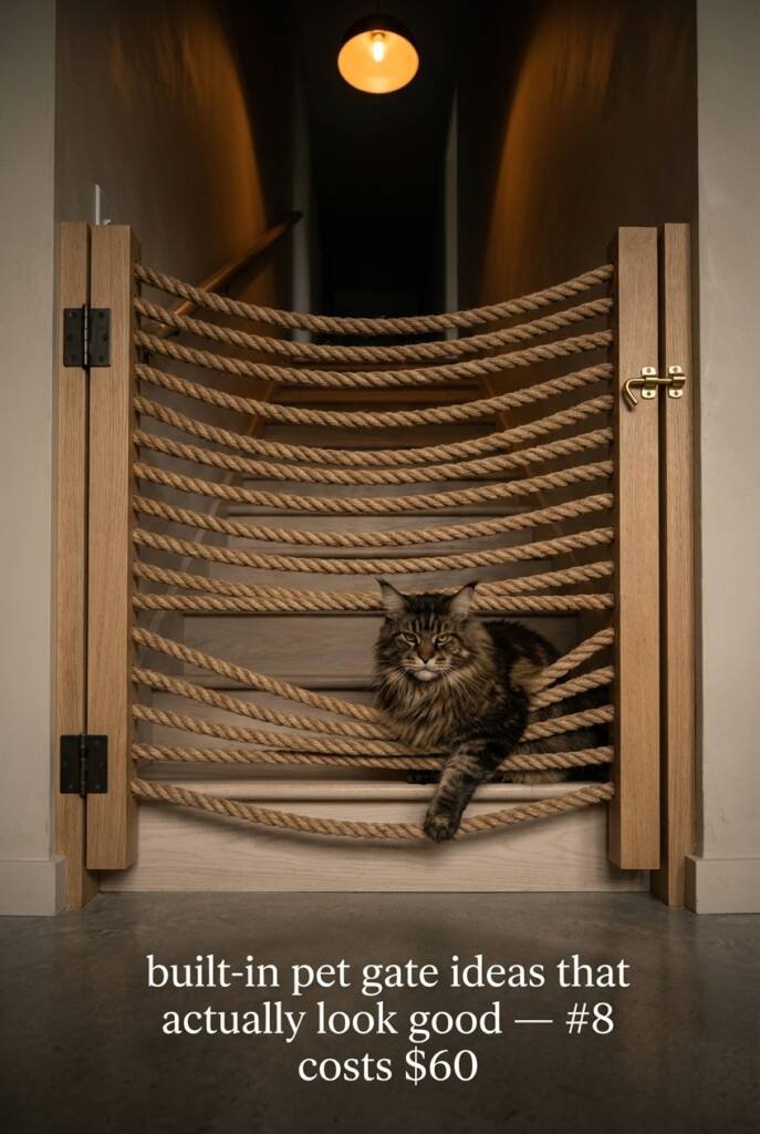 A shallow bookshelf — just 4–6 inches deep — built into a hinged wooden frame creates a gate that looks like built-in cabinetry when closed and swings open like a secret passageway when you need through. Stack it with small plants, candles, or actual books, and guests won’t even register it as a pet barrier. It’s the kind of detail that makes people ask who your designer is.
