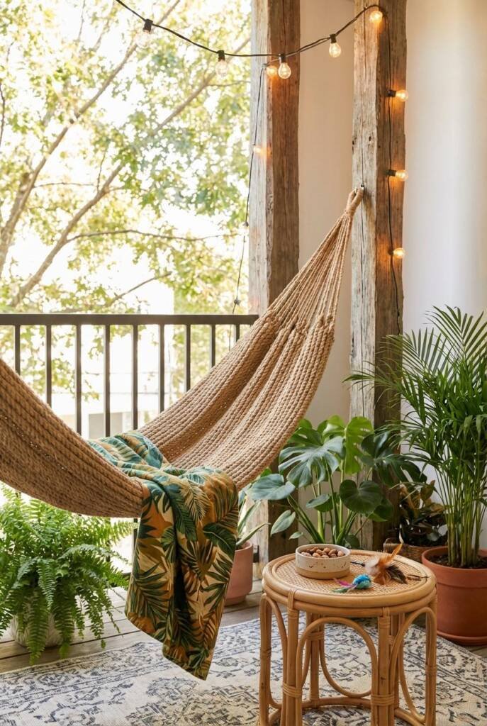 This setup becomes part lounging spot, part scratch pad, part climbing challenge. Its woven texture naturally complements tropical boho décor, and the suspended design makes it feel like something pulled straight from a coastal hideaway or beach resort. Add a small cushion or folded tropical throw on one side to give your cat a plush landing zone.